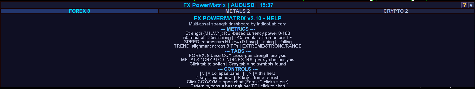 See the Entire Market at a Glance FX PowerMatrix 28 is a professional-grade multi-asset dashboard that calculates and displays real-time currency strength and momentum across 8 timeframes — from M1 to W1 — in a single compact panel directly on your chart. Stop guessing which currency is strong, which is weak, and where the best trade setups are forming. FX PowerMatrix does the analysis for you and highlights the opportunities instantly. What It Does FX PowerMatrix measures the relative strength of 8 major currencies (USD, EUR, GBP, JPY, CHF, AUD, NZD, CAD) by analyzing RSI values across all 28 cross-pairs. The result is a clear, color-coded matrix showing exactly where the power lies at every timeframe. Switch to Metals, Crypto, or Indices tabs with a single click to analyze additional asset classes using the same proven methodology. Key Features