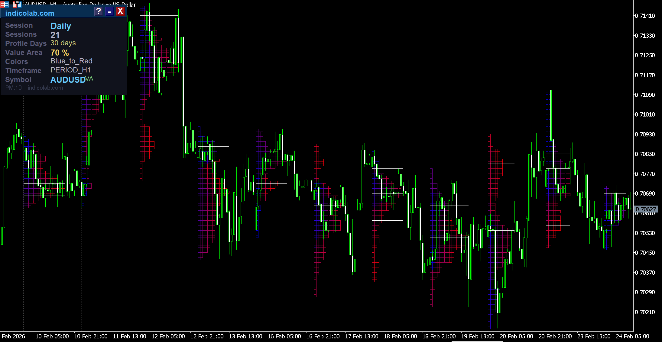The indicator calculates Point of Control (POC), Value Area High (VAH), Value Area Low (VAL), and the full TPO histogram for each trading session.