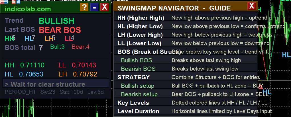 SwingMap Navigator is a professional market structure analysis tool that automatically identifies swing highs and lows using ZigZag, labels them as HH, HL, LH, LL, detects Break of Structure (BOS) events, and displays actionable trading signals on an elegant draggable panel.